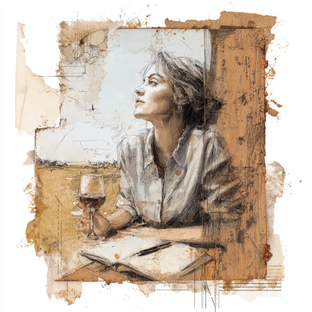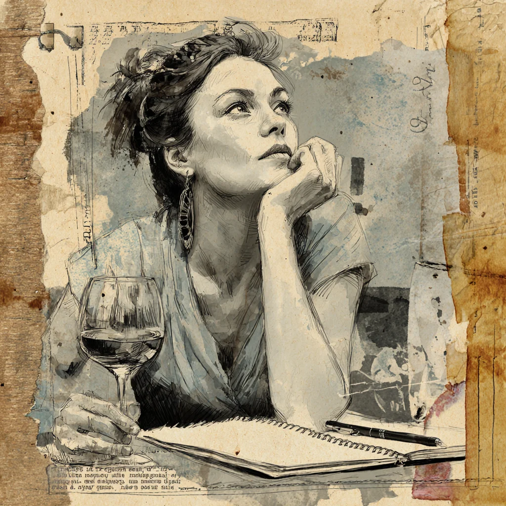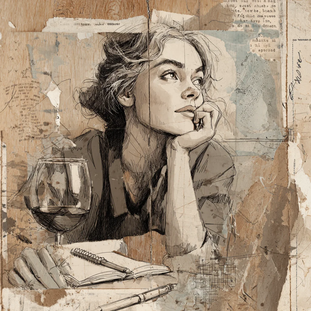 El papel rugoso recibe la tinta igual que mi memoria recibe el vino: absorbiendo cada gota, dejando una marca indeleble. Escribo cartas que no voy a enviar, describo silencios que ya no nos pertenecen, y dibujo rostros que el tiempo empieza a borrar.