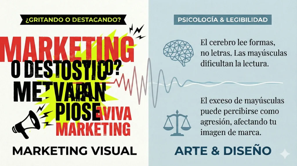 La regla de diseño: Las mayúsculas son excelentes para titulares cortos, logos o botones de «Llamada a la Acción» (CTA), pero son terribles para bloques de texto largos.
